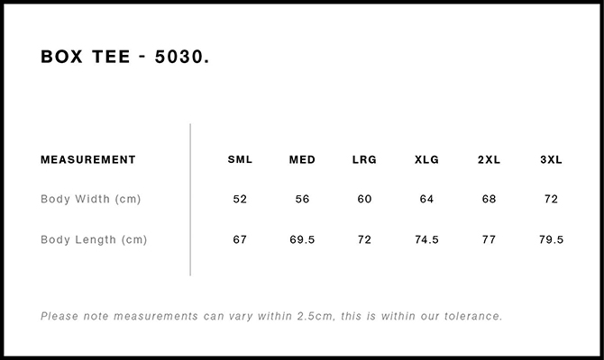 FIT: Relaxed fit - please check the size chart to avoid disappointment. Lay your own tee flat on a table, measure armpit to armpit across the chest and match to the size you feel is best. Please note measurements can vary within 2.5cm, this is within the accepted tolerance.