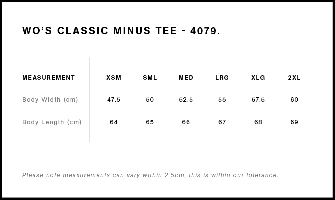 FIT: Regular fit - please check the size chart to avoid disappointment. Lay your own tee flat on a table, measure armpit to armpit across the chest and match to the size you feel is best. Please note measurements can vary within 2.5cm, this is within the accepted tolerance.